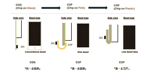 2.瀏海螢幕、挖孔螢幕、全面螢幕的背後是為追逐高螢幕佔比而不斷改進的從SMD(Surface Mounted Device)、TAB(Tape Automated Bonding)、COB(Chip on Board)、COG(Chip on Glass)到COF(Chip on Film)、COP(Chip on Plastic)封裝技術的革新、高集成度SOC(System on Chip)的應用、以及傳統硬屏往柔性屏的發展。